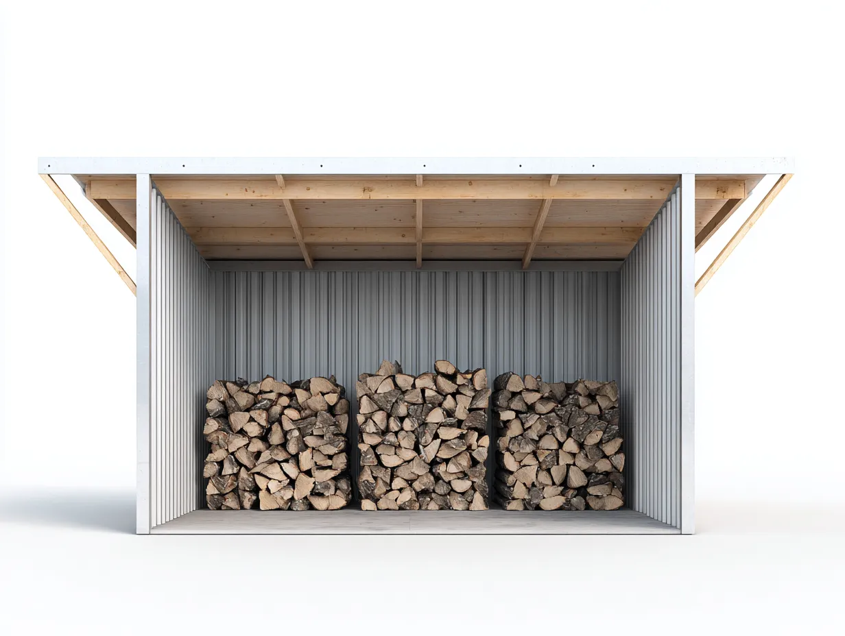La copertura superiore protegge la parte alta della legna da pioggia e sporco. I pannelli laterali e posteriori aiutano a contenere il materiale in modo ordinato. La forma aperta sul fronte rende semplice il prelievo della legna e favorisce la circolazione dell'aria. La base rialzata rispetto al terreno contribuisce a una conservazione più corretta della legna in uso domestico.