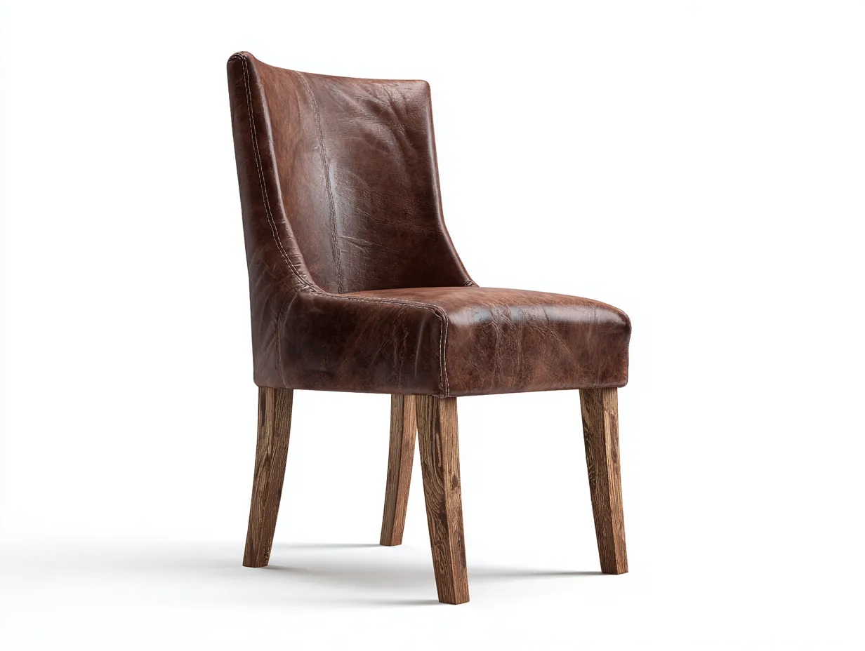 Rivestimento in pelle sintetica di colore marrone scuro con effetto naturale leggermente vissuto. Le gambe sono realizzate in legno con finitura materica che valorizza le venature, contribuendo a una struttura stabile e visivamente armoniosa.