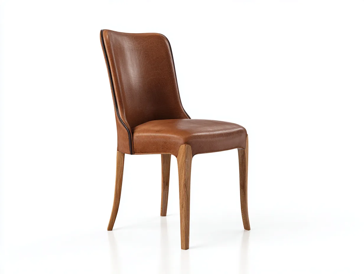 Schienale sagomato per un appoggio più avvolgente, seduta ampia adatta ai momenti a tavola, design versatile per spazi residenziali e contract, rivestimento facile da gestire nella manutenzione ordinaria, presenza decorativa equilibrata grazie al contrasto tra marrone e legno naturale.