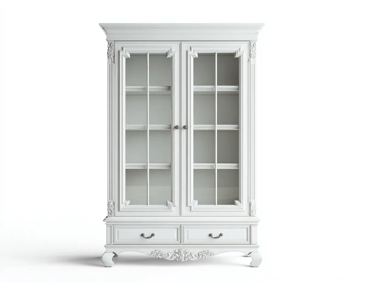 Realizzata in legno con ante in vetro, presenta una finitura bianca che valorizza i dettagli decorativi. Le superfici sono lavorate con attenzione per garantire una buona durata e un aspetto armonioso nel tempo.